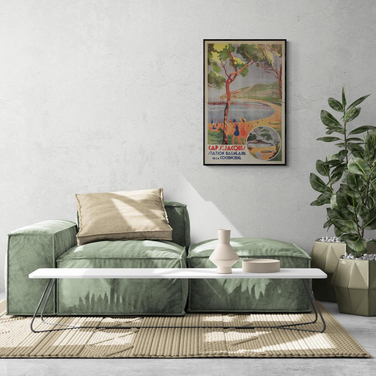 Impressive 76 x 116 cm poster which was used over 100 years ago to promote travel to the Vietnamese resort of Vung Tau, which in French colonial times was known as Cap St. Jacques. The poster has the text: " Cochinchine Balnéaire Station ", meaning the seaside resort of Cochinchine, a historic region that makes up the southern third of Vietnam, with the largest city being Ho Chi Minh City. Vietnamese call it Nam Bộ , which means "the southern border country".
