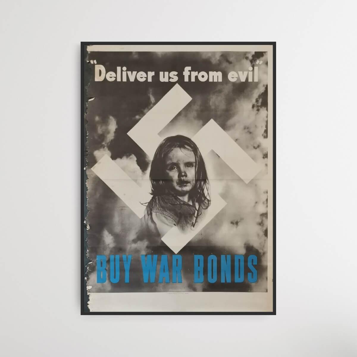 Scary poster from World War II where this sad motif was used to get American citizens to support the war by buying war bonds. A depressing black-and-white photo of a sad young girl surrounded by smoke or clouds. The image is centered around a white swastika.