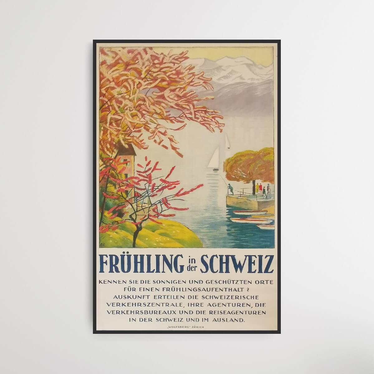 Very beautiful Swiss poster from 1921 which still stands out 100 years later. The title can be translated to Spring in Switzerland . At the time of writing, this poster can not be purchased anywhere else on the internet and we have not seen it in such upscale condition before. There are two smaller folds that should be leveled in a frame, but in addition, the poster is in impeccable condition.