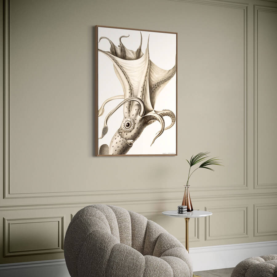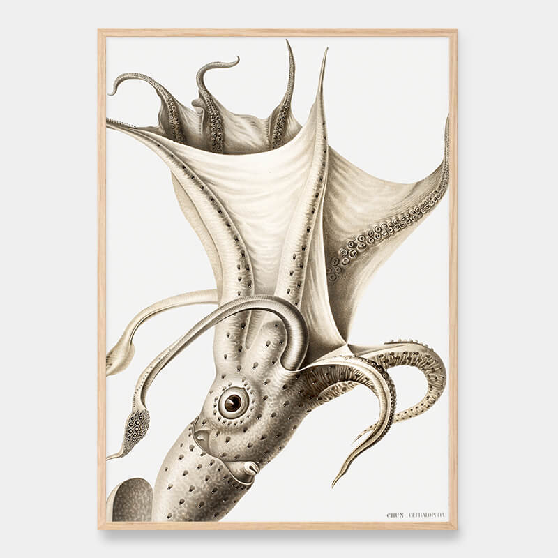 Cockeyed squid illustrated in Deutschen Tiefsee-Expedition, German Deep Sea Expedition in 1898 by German marine biologist Carl Chun (1851 - 1914). We have digitally modified the original from the Biodiversity Heritage Library to create this beautiful poster. We print with 12 colors on 240 gram matte premium paper.