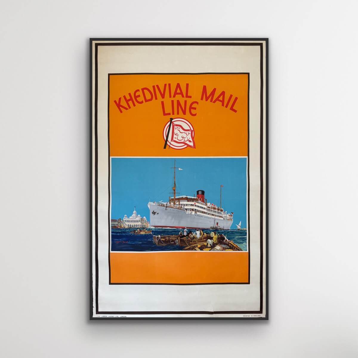 Very rare original vintage poster in orange and blue of the Khedivial Mail Line, a steamship company that operated ships from Alexandria, Egypt. The exact date of the company's establishment is unknown, but it was most likely in the latter half of the 19th century.