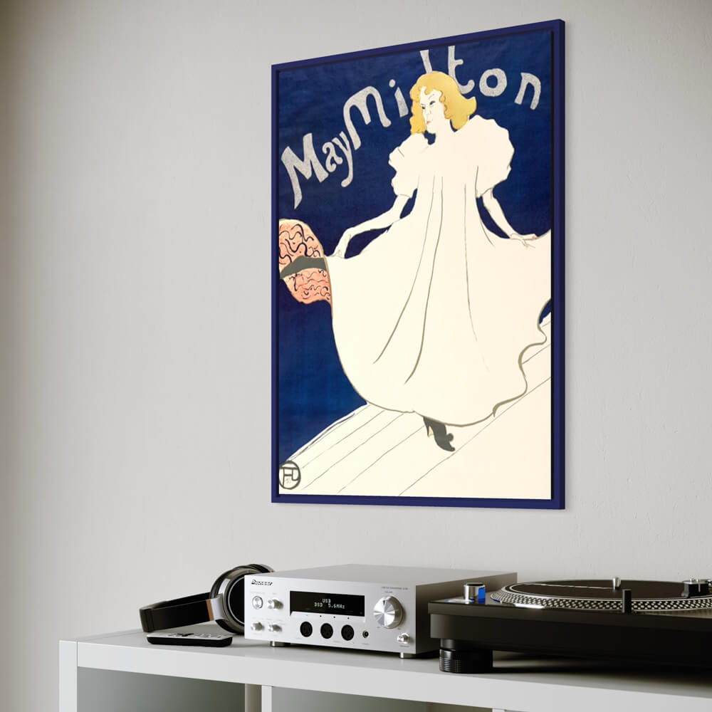 The poster shows the English dancer May Milton, who performed at the Moulin Rouge in Paris. This poster was made to advertise her US tour.