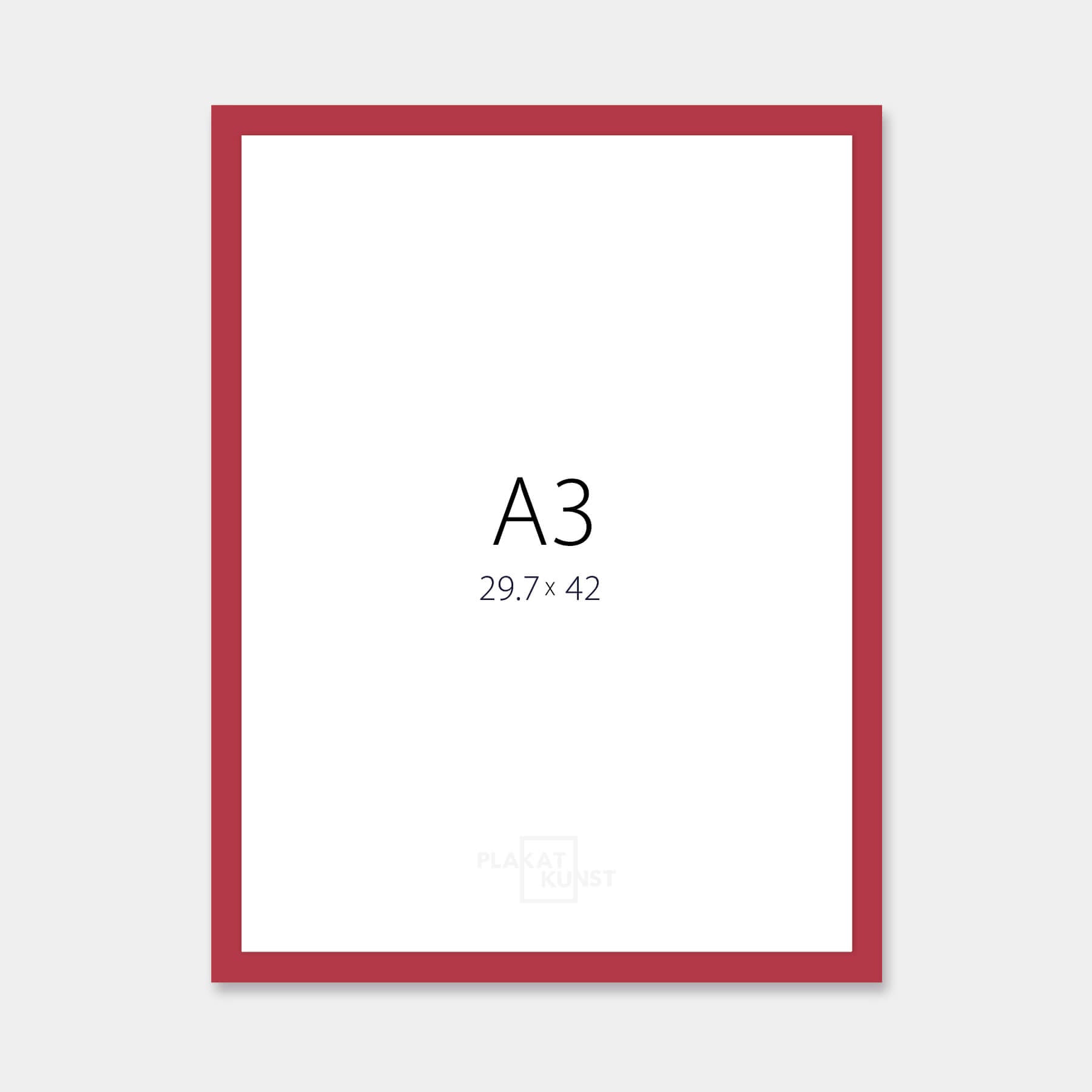 Matte dark red frame for A3 photos (29.7x42 cm). The wooden frame has a 15 mm front, 13 mm depth and slightly rounded edges, as well as a nice varnish that does not leave the wooden frame over time. Made in Denmark to order.