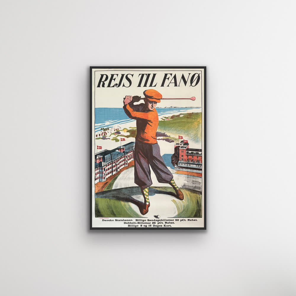 Extremely rare Danish travel poster from the first years of the 20th century. The poster was also available in an English version, and tries to lure tourists to the small island on the Danish west coast with sun, summer and golf.