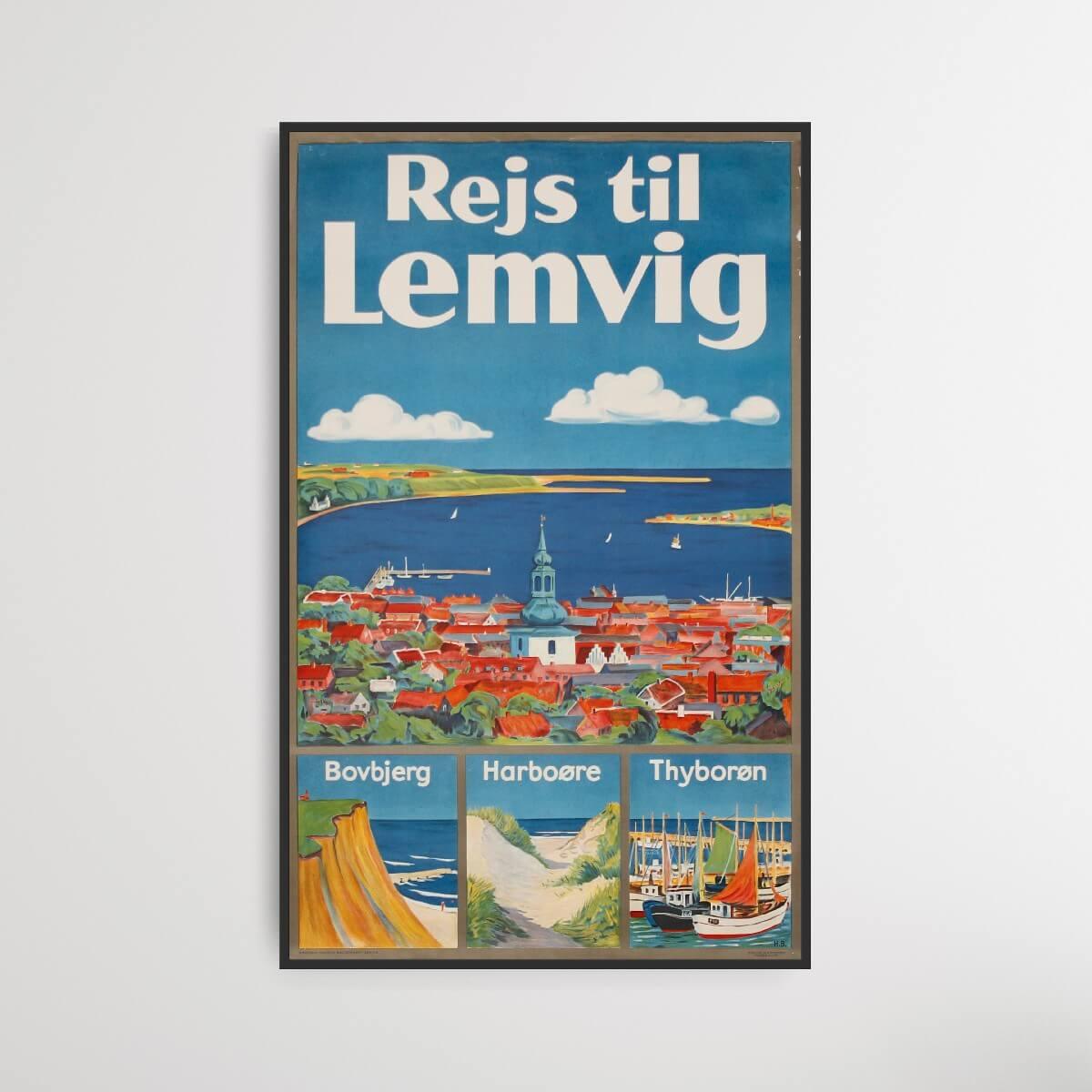 This colorful original vintage poster promotes Lemvig as a tourist destination. Lemvig is a 750-year-old market town. One of the landmarks in Lemvig is the town church from the 13th century. The old town lies between the Limfjord, hills and a lake. The poster also mentions the villages of Bovbjerg, Harboøre and Thyborøn.